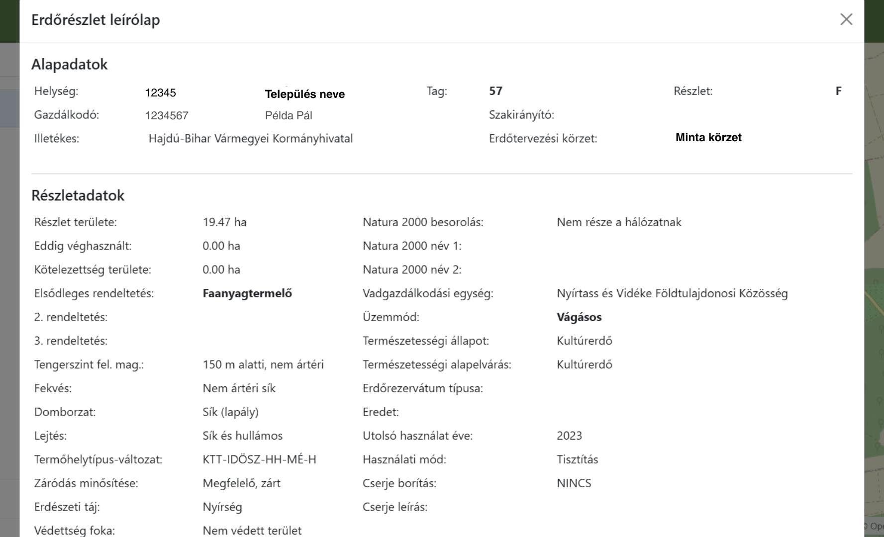 Az erdőrészletekhez tartozó leírólapok megjeleníthetők a térképi rétegekről, valamint a funkciókból.